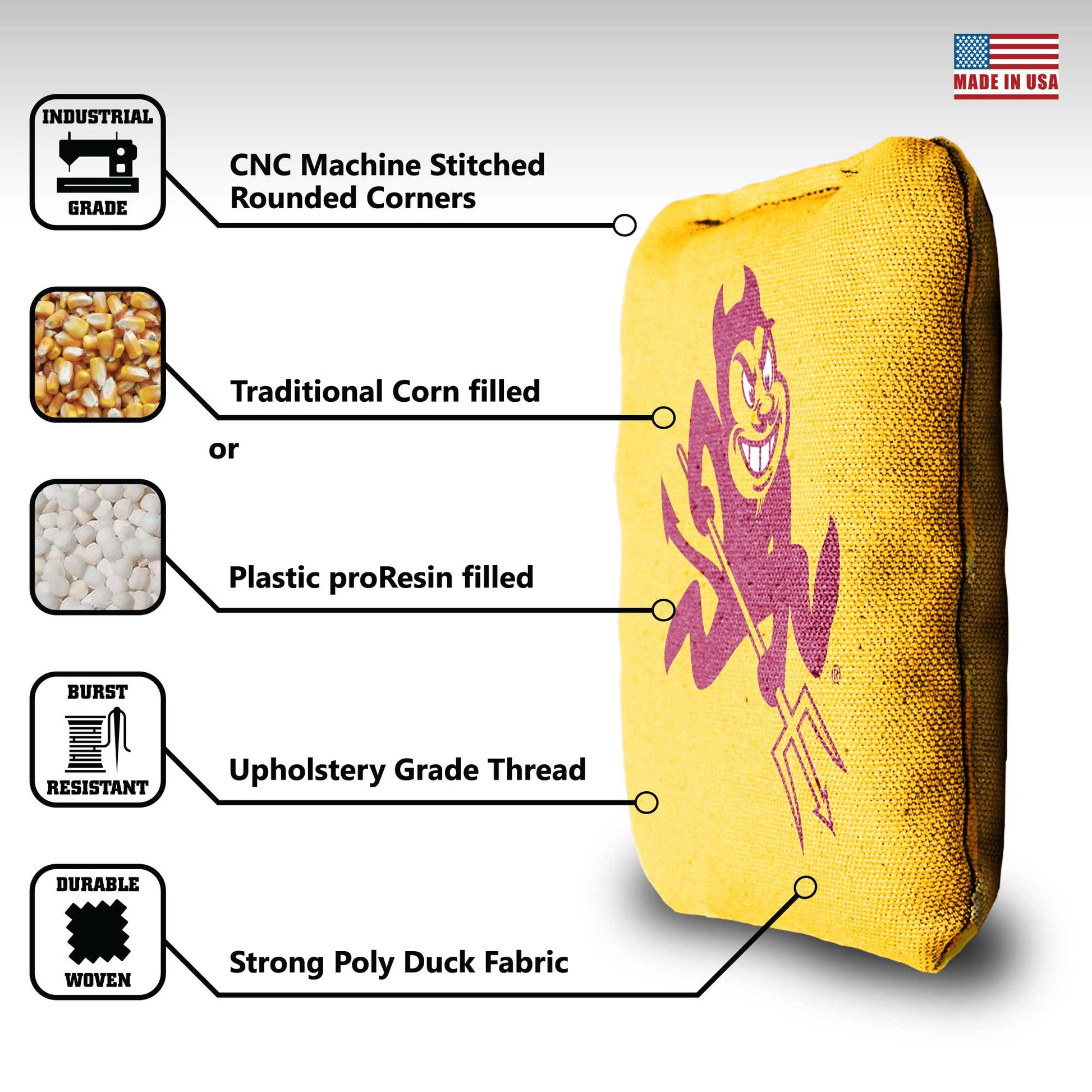 Show everybody your school's the best with your Arizona State University cornhole bags. These bags are essential and every point you score with them will feel like you’re helping your team to victory. Bring out your bags, chest bump your friends, and show your school pride!